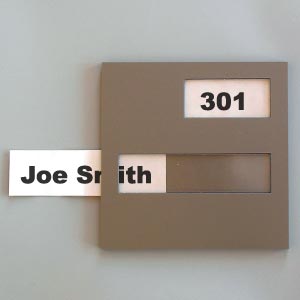 We have a number of creative solutions to match your needs. Our interchangeable systems allow your signs to change and grow as often as you do. Our selections will provide your workplace with an easy-to-read, easy-to-update, professional solution. | Paper Slot Systems ![]() ![]() ![]() ![]() ![]() |